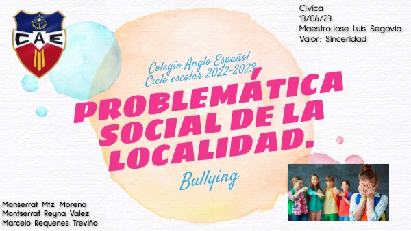Enterapia.(2021).Problemas sociales: ¿Qué son y cómo surgen?.https://enterapia.co/blog/bienestar/que-son-los-problemas-sociales Sevilla,M y Sanchez,M. (2022).Bullying.https://cuidateplus.marca.com/enfermedades/psicologicas/bullying.html LATAM Global School.(2022).BULLYING: QUÉ ES, CAUSAS Y CONSECUENCIAS. https://www.latamglobalschool.com/blog/bullying-que-es-causas-y-consecuencias/ Universidad Internacional de Valencia.(2014).Bullying: consecuencias en la víctima y el agresor. https://www.universidadviu.com/co/actualidad/nuestros-expertos/bullying-consecuencias-en-la-victima-y-el-agresor Secretaria de Educación Pública.(2017).PROTOCOLO PARA LA PREVENCIÓN, DETECCIÓN Y ACTUACIÓN EN CASOS DE ABUSO, ACOSO Y MALTRATO EN LAS ESCUELAS PÚBLICAS DE EDUCACIÓN BÁSICA.https://www.gob.mx/cms/uploads/attachment/file/295965/Protocolo_Queretaro.pdf