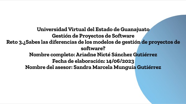 Universidad Virtual del Estado de Guanajuato Gestión de Proyectos de Software Reto 3.¿Sabes las diferencias de los modelos de gestión de proyectos de software? Nombre completo: Ariadne Nicté Sánchez Gutiérrez Fecha de elaboración: 14/06/2023 Nombre del asesor: Sandra Marcela Munguía Gutiérrez