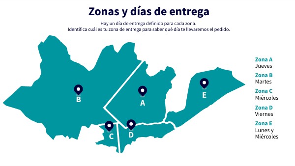 Hay un día de entrega definido para cada zona. Identifica cuál es tu zona de entrega para saber qué día te llevaremos el pedido.