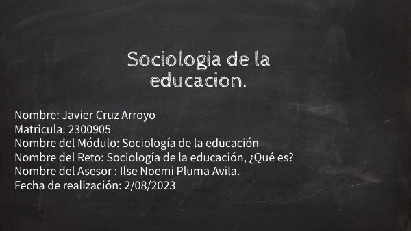 Nombre: Javier Cruz ArroyoMatricula: 2300905 Nombre del Módulo: Sociología de la educación Nombre del Reto: Sociología de la educación, ¿Qué es? Nombre del Asesor : Ilse Noemi Pluma Avila. Fecha de realización: 2/08/2023