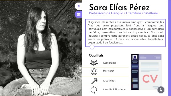 M'agraden els reptes i assumeixo amb grat i compromís les fites que se'm proposen, fent front a tasques tant individuals com colaboratives o cooperatives. Em considero metòdica, resolutiva, productiva i proactiva. Soc molt inquieta i sempre estic aprenent coses noves, la qual cosa em fa ser polivalent. A més, soc responsable, treballadora, organitzada i perfeccionista.