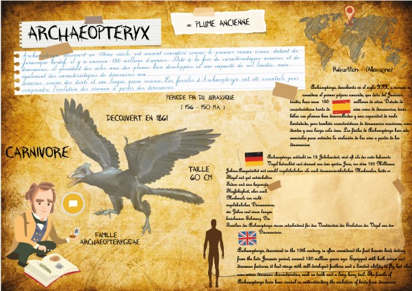 Archaeopteryx, découvert au 19ème siècle, est souvent considéré comme le premier oiseau connu, datant du Jurassique tardif, il y a environ 150 millions d'années. Doté à la fois de caractéristiques aviaires et de dinosaures, il possédait des ailes avec des plumes bien développées et une capacité de vol limitée, mais également des caractéristiques de dinosaures nonaviaires, comme des dents et une longue queue osseuse.Les fossiles d'Archaeopteryx ont été essentiels pour comprendre l'évolution des oiseaux à partir des dinosaures.