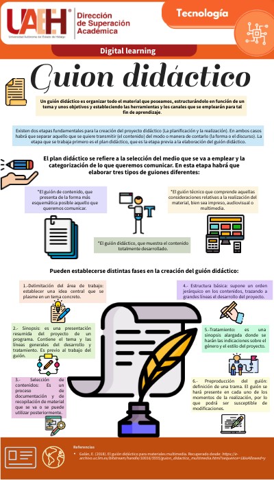 - Galán, E. (2018). El guión didáctico para materiales multimedia. Recuperado desde: https://e-archivo.uc3m.es/bitstream/handle/10016/5555/guion_didactico_multimedia.html?sequence=1&isAllowed=y