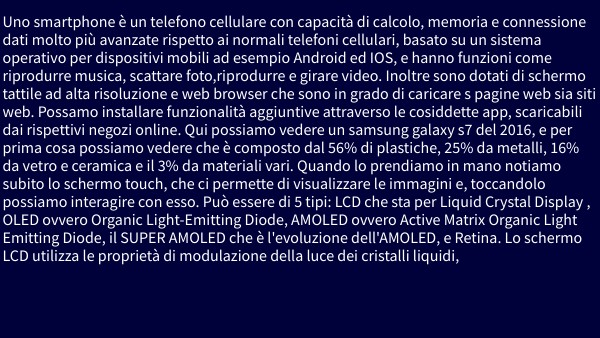 Uno smartphone è un telefono cellulare con capacità di calcolo, memoria e connessione dati molto più avanzate rispetto ai normali telefoni cellulari, basato su un sistema operativo per dispositivi mobili ad esempio Android ed IOS, e hanno funzioni come riprodurre musica, scattare foto,riprodurre e girare video. Inoltre sono dotati di schermo tattile ad alta risoluzione e web browser che sono in grado di caricare s pagine web sia siti web. Possamo installare funzionalità aggiuntive attraverso le cosiddette app, scaricabili dai rispettivi negozi online. Qui possiamo vedere un samsung galaxy s7 del 2016, e per prima cosa possiamo vedere che è composto dal 56% di plastiche, 25% da metalli, 16% da vetro e ceramica e il 3% da materiali vari. Quando lo prendiamo in mano notiamo subito lo schermo touch, che ci permette di visualizzare le immagini e, toccandolo possiamo interagire con esso. Può essere di 5 tipi: LCD che sta per Liquid Crystal Display , OLED ovvero Organic Light-Emitting Diode, AMOLED ovvero Active Matrix Organic Light Emitting Diode, il SUPER AMOLED che è l'evoluzione dell'AMOLED, e Retina. Lo schermo LCD utilizza le proprietà di modulazione della luce dei cristalli liquidi,