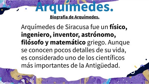 Arquímedes de Siracusa fue un físico, ingeniero, inventor, astrónomo, filósofo y matemático griego. Aunque se conocen pocos detalles de su vida, es considerado uno de los científicos más importantes de la Antigüedad.