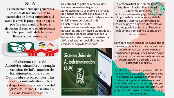 De entrada Los patrones con 5 o más trabajadores están obligados a autodeterminarse usando el Sistema, la que puede efectuarse con apoyo en la información que por medio del proceso de emisión le proporcione el IMSSCaracterísticas de salida con los mecanismos de seguridad necesarios, que permiten a las Entidades Receptoras (Bancos) identificar que la información efectivamente proviene del SUA, y así estar en posibilidades de efectuar el pago de las mismas