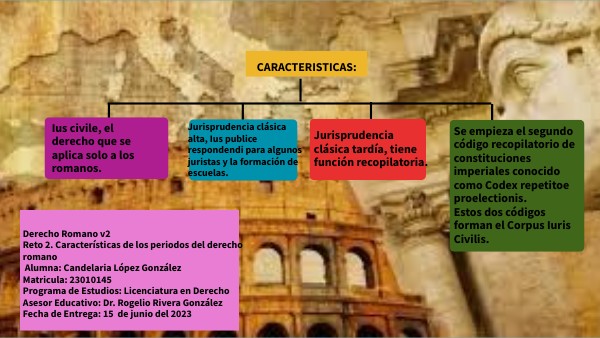 Derecho Romano v2 Reto 2. Características de los periodos del derecho romano Alumna: Candelaria López González Matricula: 23010145 Programa de Estudios: Licenciatura en Derecho Asesor Educativo: Dr. Rogelio Rivera González Fecha de Entrega: 15 de junio del 2023