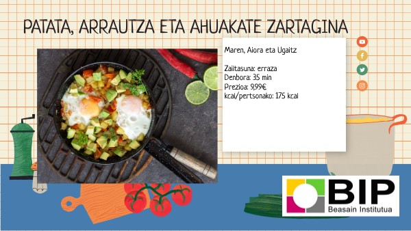 4 pertsonentzako Patata.......................................................350 g Oliba-olio birjina extra ..........................2 koilarakada Piper gorria .............................................1 Tipulina................................................... 1 Piper luze pikantea .................................1 Landako arrautza ....................................4 Ahuakate handia .....................................1 Lima-zuku koilarakatuak......................... 2 Nahi bezalako zilindro freskoa Gatza eta piperbeltza nahi bezala