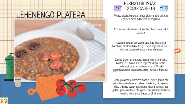 Moztu tipula, baratxuria eta piperra zati txikitan, egosten diren bitartean desegiteko. Azenarioak eta tomateak zuritu. Ebaki tomateak 2 zatitan. Kazuela batean olio zorrotada bat, tipula eta baratxuri aleak botako ditugu. Dena frijitzen dugu 10 minutuz, zaporeak ondo nahas daitezen. Gehitu piperra, tomatea, azenarioak eta erramu hostoa. 2-3 minutuz ere frijitzen dugu. Gehitu urdaiazpikoa eta kanabera eta La Verako piperrautsaren koilarakada zabal bat(nahi baduzu). Ukitu pikantea gustatzen bazaizu piper gozoa eta pikantea maila berean nahas ditzakezu, oso gozoak dira. Irabiatu azkar egurrezko koilara batekin eta gehitu jada xukatuak eta gordetako dilistak. Irabiatu berriro dena ondo batzeko. (3 minutu).