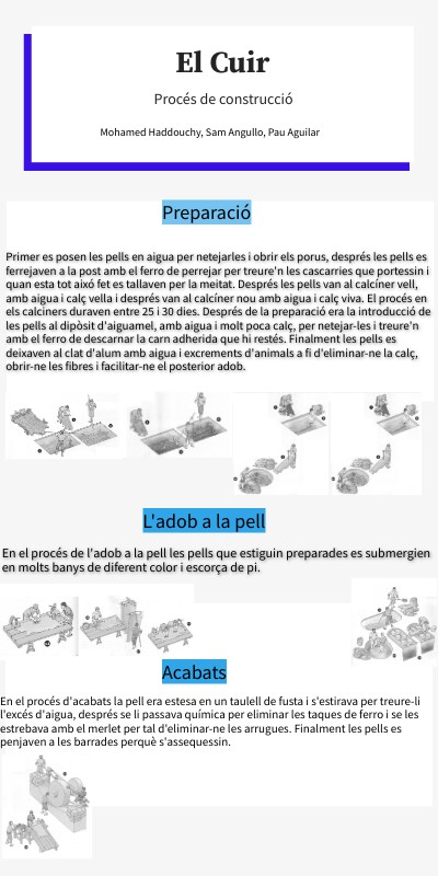 Primer es posen les pells en aigua per netejarles i obrir els porus, després les pells es ferrejaven a la post amb el ferro de perrejar per treure'n les cascarries que portessin i quan esta tot aixó fet es tallaven per la meitat. Després les pells van al calcíner vell, amb aigua i calç vella i després van al calcíner nou amb aigua i calç viva. El procés en els calciners duraven entre 25 i 30 dies. Després de la preparació era la introducció de les pells al dipòsit d'aiguamel, amb aigua i molt poca calç, per netejar-les i treure'n amb el ferro de descarnar la carn adherida que hi restés. Finalment les pells es deixaven al clat d'alum amb aigua i excrements d'animals a fi d'eliminar-ne la calç, obrir-ne les fibres i facilitar-ne el posterior adob.