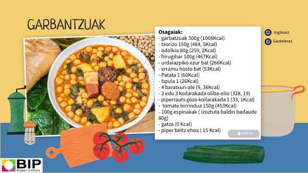 Osagaiak: - garbatzuak 300g (1008Kcal) - txorizo 150g (484, 5Kcal) - odolkia 80g (259, 2Kcal) - hirugihar 100g (467Kcal) - urdaiazpiko ezur bat (266Kcal) - erramu hosto bat (53Kcal) - Patata 1 (60Kcal) - tipula 1 (26Kcal) - 4 baratxuri-ale (9, 36Kcal) - 2 edo 3 koilarakada oliba-olio (328, 19) - piperrauts gozo koilarakada 1 (33, 1Kcal) - tomate birrindua 150g (453Kcal) - 100g espinakak ( izoztuta baldin badaude 80g) - gatza (0 Kcal) - piper beltz ehoa ( 15 Kcal)