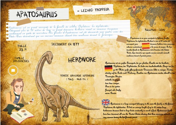 Apatosaurus est un grand sauropode de la famille du célèbre Diplodocus, les diplodocidés. Atteignant plus de 20 mètres de long, ce grand dinosaure herbivore vivait en immenses troupeaux constamment en quête de nourriture.Des fossiles d’Apatosaurus ont été découverts aux quatre coins des Etats-Unis démontrant que ces énormes animaux étaient très nombreux durant le Jurassique.