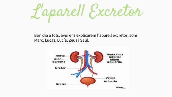 Bon dia a tots, avui ens explicarem l'aparell excretor; som Marc, Lucas, Lucía, Zeus i Saúl.