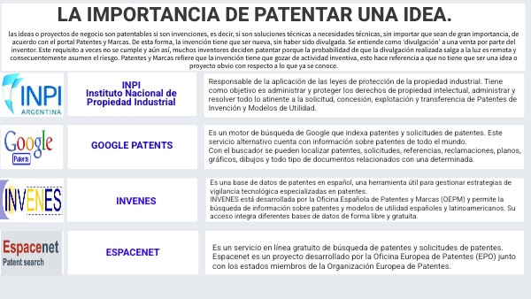 Es una base de datos de patentes en español, una herramienta útil para gestionar estrategias de vigilancia tecnológica especializadas en patentes. INVENES está desarrollada por la Oficina Española de Patentes y Marcas (OEPM) y permite la búsqueda de información sobre patentes y modelos de utilidad españoles y latinoamericanos. Su acceso integra diferentes bases de datos de forma libre y gratuita.