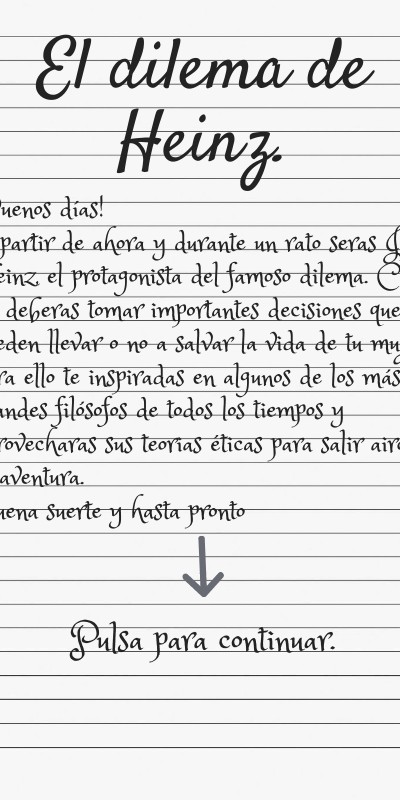 ¡Buenos días!A partir de ahora y durante un rato serás Joseph Heinz, el protagonista del famoso dilema. Como tal, deberás tomar importantes decisiones que pueden llevar o no a salvar la vida de tu mujer; Para ello te inspiradas en algunos de los más grandes filósofos de todos los tiempos y aprovecharás sus teorías éticas para salir airoso de tu aventura. Buena suerte y hasta pronto.