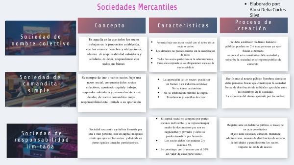 Se compoe de uno o varios socios, bajo una razon social, compuesta delos socios colectivos, aportando capitaly trabajo, respondes subcidaria y personalmente a sus deudas, de socios comanditos cuaya responsabilidad esta limitada a su aportación