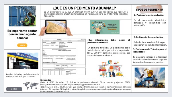 Referencias: -Ortiz, A. (2020, December 11). Qué es un pedimento aduanal | Tipos, formato y ejemplo. DRIP/c. https://www.dripcapital.com/es-mx/recursos/blog/pedimento-aduanal. -Logistics, S. A. (2021, November 25). Qué es el pedimento aduanal y cuál es su importancia en comercio exterior - SK Logistics. SK Logistics. https://sklogistics.com.mx/que-es-el-pedimento-aduanal-y-cual-es-su-importancia-en-comercio-exterior/