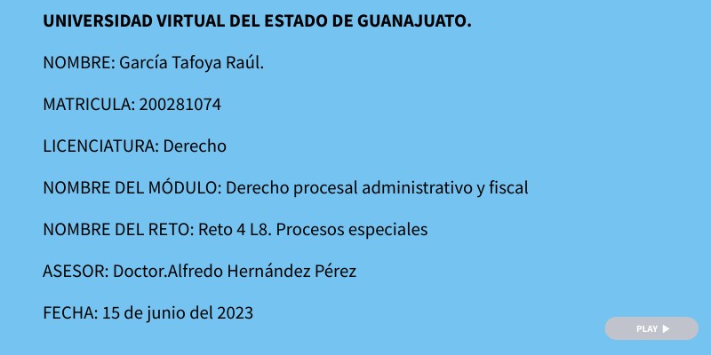 UNIVERSIDAD VIRTUAL DEL ESTADO DE GUANAJUATO. NOMBRE: García Tafoya Raúl. MATRICULA: 200281074 LICENCIATURA: Derecho NOMBRE DEL MÓDULO: Derecho procesal administrativo y fiscal NOMBRE DEL RETO: Reto 4 L8. Procesos especiales ASESOR: Doctor.Alfredo Hernández Pérez FECHA: 15 de junio del 2023