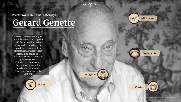 Gérard Genette (París, 7 de junio de 1930-11 de mayo de 2018) fue un escritor, crítico y teórico literario francés, uno de los creadores de la narratología.Tras estudiar Letras, fue alumno de la Escuela Normal Superior y agregado de letras. Coincidió en Mans con J. Derrida. Ya en 1967, fue nombrado profesor de Literatura francesa en la Sorbona