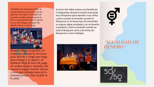 despues llega su patrón y le empieza a llamar la atencion para decirle y exigir que haga mas trabajo y se apure y al finalizar llega la hora de pago de ambos (papá y mamá) y ala mamá le pagan mucho menos y tuvo que trabajar mas de lo normal porque solo su jefe se lo pido.