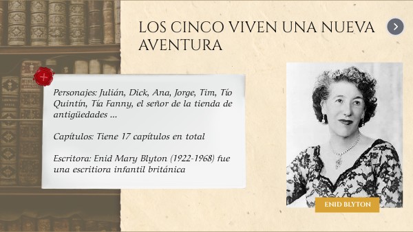 Personajes: Julián, Dick, Ana, Jorge, Tim, Tío Quintín, Tía Fanny, el señor de la tienda de antigüedades ...Capítulos: Tiene 17 capítulos en total Escritora: Enid Mary Blyton (1922-1968) fue una escritiora infantil británica