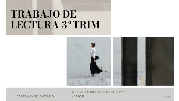 QUERIDA ÁNGELA VICARIO:TE ESCRIBO PORQUE HACE POCO LEÍ "CRÓNICA DE UNA MUERTE ANUNCIADA Y TU PERSONAJE ME LLAMÓ LA ATENCIÓN. DESDE QUE EMPECÉ EL LIBRO, TU PERSONAJE ME HIZO INTERESARME POR LA HISTORIA. TU VIDA FUE MARCADA POR UNA SERIE DE EVENTOS DESAFORTUNADOS Y DECISIONES DIFÍCILES QUE, DE ALGUNA FORMA, TE LLEVARON A ESTAR EN EL CENTRO DE UNA TRAGEDIA TAN IMPACTANTE. ENTIENDO QUE TE ENCONTRASTE EN UNA SITUACIÓN MUY COMPLICADA CUANDO TE OBLIGARON A REVELAR EL NOMBRE DE TU PRESUNTO AGRESOR. AUNQUE MUCHOS TE JUZGARON POR EL DESTINO DE SANTIAGO NASAR, ES IMPORTANTE RECORDAR QUE TÚ TAMBIÉN FUISTE VICTIMA DE UNA AGRESIÓN.