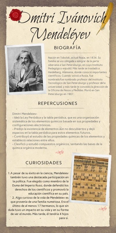 1.A pesar de su éxito en la ciencia, Mendeleiev también tuvo una destacada participación en la política. Fue elegido como miembro de la Duma del Imperio Ruso, donde defendió los derechos de los científicos y promovió la educación científica en su país.2. Algo curioso de la vida de Mendeleiev es que provenía de una familia numerosa. Era el último de al menos 17 hermanos, lo que sin duda tuvo un impacto en su vida y en su forma de ver el mundo. Más tarde, él tendría 4 hijos para sí.