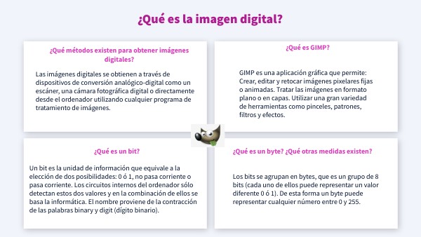 GIMP es una aplicación gráfica que permite: Crear, editar y retocar imágenes pixelares fijas o animadas. Tratar las imágenes en formato plano o en capas. Utilizar una gran variedad de herramientas como pinceles, patrones, filtros y efectos.