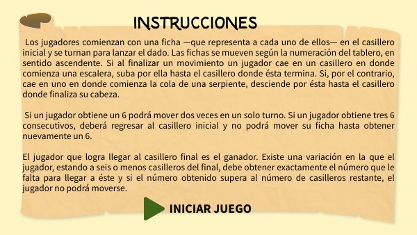 Los jugadores comienzan con una ficha —que representa a cada uno de ellos— en el casillero inicial y se turnan para lanzar el dado. Las fichas se mueven según la numeración del tablero, en sentido ascendente. Si al finalizar un movimiento un jugador cae en un casillero en donde comienza una escalera, suba por ella hasta el casillero donde ésta termina. Si, por el contrario, cae en uno en donde comienza la cola de una serpiente, desciende por ésta hasta el casillero donde finaliza su cabeza. Si un jugador obtiene un 6 podrá mover dos veces en un solo turno. Si un jugador obtiene tres 6 consecutivos, deberá regresar al casillero inicial y no podrá mover su ficha hasta obtener nuevamente un 6. El jugador que logra llegar al casillero final es el ganador.