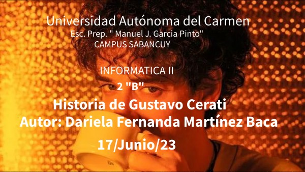 Bueno a continuación volvi hacer otro tema por complicaciones de que el primer tema que hice lo perdi en la conclusión explicare un poco del porque, antes que nada eleji este tema porque desde que tenia 10 años este cantante se volvio parte de mi vida, la musica es algo que la mayoría de las persona les gusta, ya que es una forma de poder expresar sus sentimientos a travéz de ellos, por mi parte sentir que la música es parte de tu vida es maravilloso y decidi de hablar de este artísta apesar de que el tuvo un tragico accidente y fallecio tan joven conmovio a varias personas de algunos paises, en si Gustavo Cerati sus canciones e inclusive la banda de rock latino que fundo dio muchos reconocimiento a nivel mundial, cada cancion y cada album da muchos significa de su letra, gustavo cerati es uno de los mejores del rock latino, por mi lado es mi cantante favorita desde los 10 años ya que "Fue" fue una de las prieras canciones que escuche por medio de un radio en mi casa esa canción me identifo su letra representa muchas cosas, pero dado asi con el paso de los años me gusta mas porque ya que la canción " Fue remasterizado 2007" era de la banda soda stereo de ahi fue donde conoci al artista y hablare un poco de el