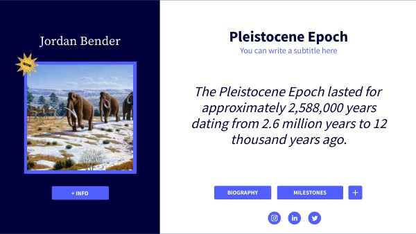 In the Pleistocene Epoch, while there were animals then that we now share the world with today, there were also many that we missed out on. Some of those animals were mammoths, sloths, saber tooth cats, short faced bears, megalodons, and more. The human spieces also evolved over this time span.