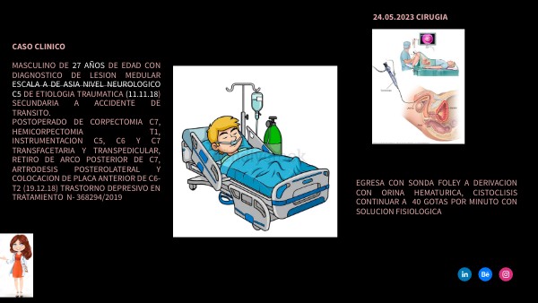 CASO CLINICO MASCULINO DE 27 AÑOS DE EDAD CON DIAGNOSTICO DE LESION MEDULAR ESCALA A DE ASIA NIVEL NEUROLOGICO C5 DE ETIOLOGIA TRAUMATICA (11.11.18) SECUNDARIA A ACCIDENTE DE TRANSITO. POSTOPERADO DE CORPECTOMIA C7, HEMICORPECTOMIA T1, INSTRUMENTACION C5, C6 Y C7 TRANSFACETARIA Y TRANSPEDICULAR, RETIRO DE ARCO POSTERIOR DE C7, ARTRODESIS POSTEROLATERAL Y COLOCACION DE PLACA ANTERIOR DE C6-T2 (19.12.18) TRASTORNO DEPRESIVO EN TRATAMIENTO