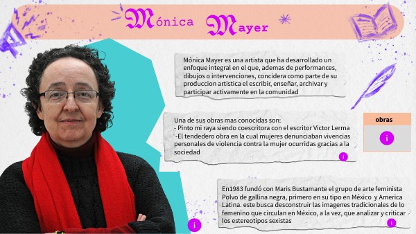 Mónica Mayer es una artista que ha desarrollado un enfoque integral en el que, ademas de performances, dibujos o intervenciones, concidera como parte de su produccion artistica el escribir, enseñar, archivar y participar activamente en la comunidad