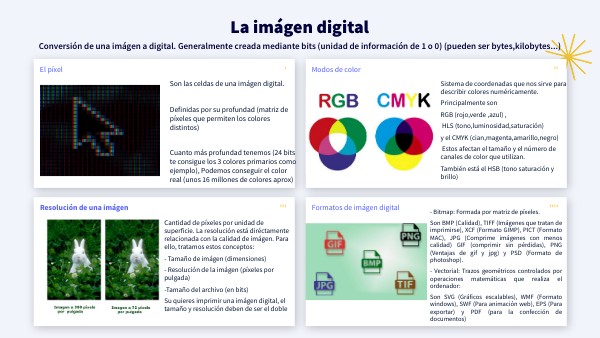 Son las celdas de una imágen digital. Definidas por su profundad (matriz de píxeles que permiten los colores distintos) Cuanto más profundad tenemos (24 bits te consigue los 3 colores primarios como ejemplo), Podemos conseguir el color real (unos 16 millones de colores aprox)