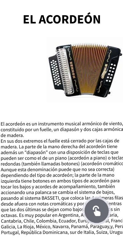 El acordeón es un instrumento musical armónico de viento, constituido por un fuelle, un diapasón y dos cajas armónicas de madera. En sus dos extremos el fuelle está cerrado por las cajas de madera. La parte de la mano derecha del acordeón tiene además un "diapasón" con una disposición de teclas que pueden ser como el de un piano (acordeón a piano) o teclas redondas (también llamadas botones) (acordeón cromático. Aunque esta denominación puede que no sea correcta) dependiendo del tipo de acordeón; la parte de la mano izquierda tiene botones en ambos tipos de acordeón para tocar los bajos y acordes de acompañamiento, también accionando una palanca se cambia el sistema de bajos, pasando al sistema BASSETI, que coloca las 4 primeras filas desde afuera con notas cromáticas y por octavas, mientras que las dos últimas se dejan como bajos y contrabajos sin octavas. Es muy popular en Argentina, Asturias, Bulgaria, Cantabria, Chile, Colombia, Ecuador, Europa Central, Francia, Galicia, La Rioja, México, Navarra, Panamá, Paraguay,y, Perú, Portugal, República Dominicana, sur de Italia, Suiza, Uruguay