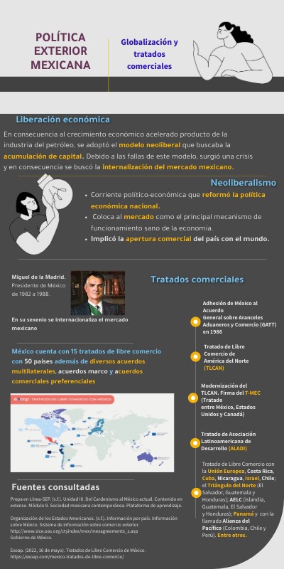 Prepa en Línea-SEP. (s.f.). Unidad III. Del Cardenismo al México actual. Contenido en extenso. Módulo 9. Sociedad mexicana contemporánea. Plataforma de aprendizaje.Organización de los Estados Americanos. (s.f.). Información por país. Información sobre México. Sistema de información sobre comercio exterior. http://www.sice.oas.org/ctyindex/mex/mexagreements_s.aspGobierno de México. Exoap. (2022, 16 de mayo). Tratados de Libre Comercio de México. https://exoap.com/mexico-tratados-de-libre-comercio/