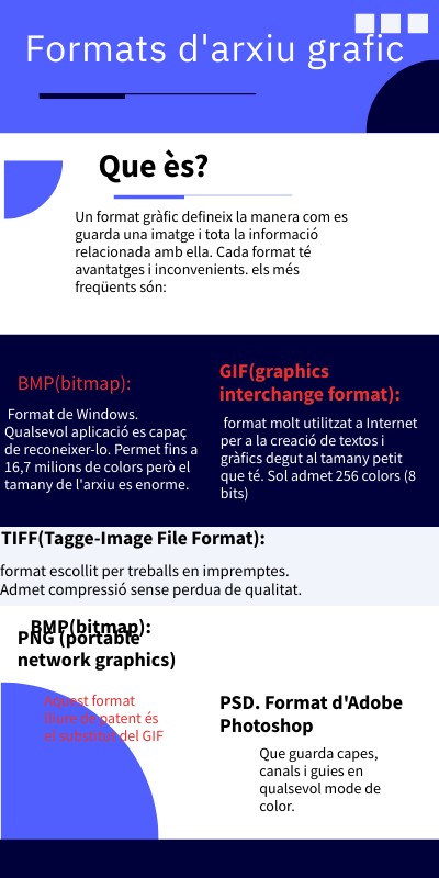 Un format gràfic defineix la manera com es guarda una imatge i tota la informació relacionada amb ella. Cada format té avantatges i inconvenients. els més freqüents són: