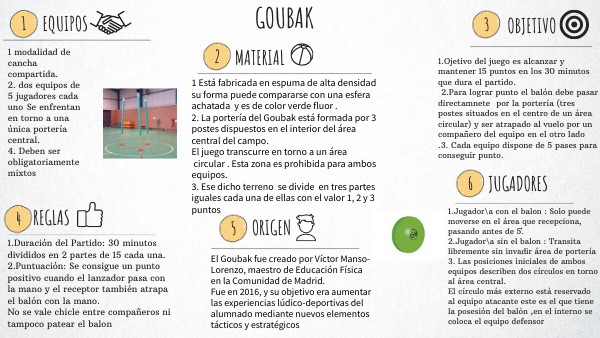 1 Está fabricada en espuma de alta densidad su forma puede compararse con una esfera achatada y es de color verde fluor .2. La portería del Goubak está formada por 3 postes dispuestos en el interior del área central del campo. El juego transcurre en torno a un área circular . Esta zona es prohibida para ambos equipos. 3. Ese dicho terreno se divide en tres partes iguales cada una de ellas con el valor 1, 2 y 3 puntos