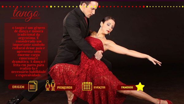 o tango é um gênero de dança e música tradicional da argentima. É considerado um importante símbolo cultural desse país e apresenta uma enorme carga emocional e dramática. A dança é feita em pares para realizá-la é necessário habilidade e expresividade.