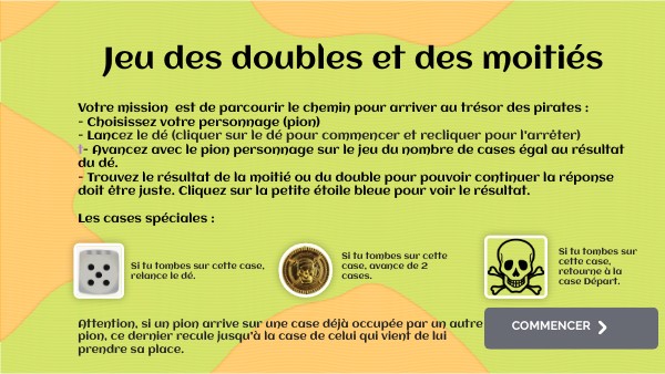 Votre mission est de parcourir le chemin pour arriver au trésor des pirates :- Choisissez votre personnage (pion) - Lancez le dé (cliquer sur le dé pour commencer et recliquer pour l'arrêter) t- Avancez avec le pion personnage sur le jeu du nombre de cases égal au résultat du dé. - Trouvez le résultat de la moitié ou du double pour pouvoir continuer la réponse doit être juste. Cliquez sur la petite étoile bleue pour voir le résultat. Les cases spéciales :