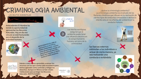 ¿Qué es la criminología ambiental?La criminología ambiental es el estudio de los factores climáticos que influyen en la realización de ciertos tipos de conductas antisociales o delitos.Su interés esta en los efectos del ambiente en la conducta humana