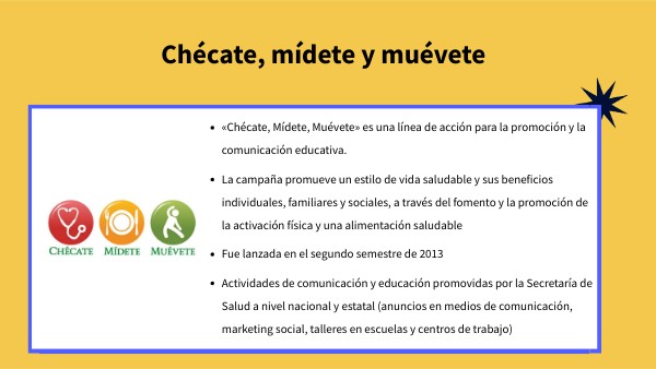 - «Chécate, Mídete, Muévete» es una línea de acción para la promoción y la comunicación educativa.