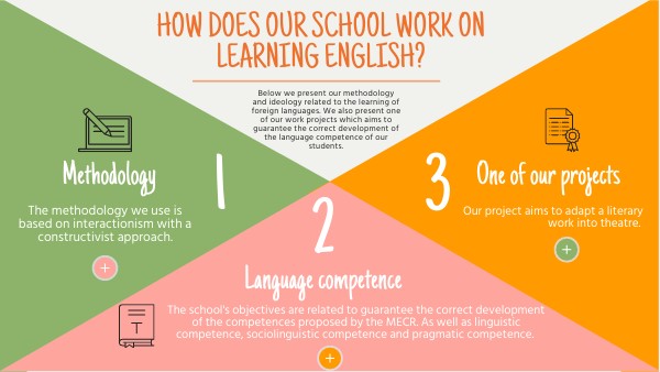 Below we present our methodology and ideology related to the learning of foreign languages. We also present one of our work projects which aims to guarantee the correct development of the language competence of our students.