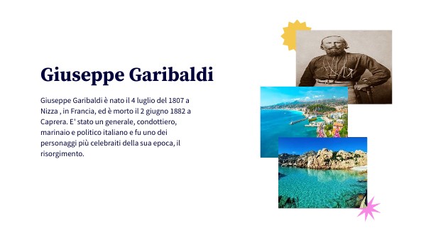 Giuseppe Garibaldi è nato il 4 luglio del 1807 a Nizza , in Francia, ed è morto il 2 giugno 1882 a Caprera. E' stato un generale, condottiero, marinaio e politico italiano e fu uno dei personaggi più celebraiti della sua epoca, il risorgimento.