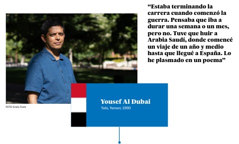 “Estaba terminando la carrera cuando comenzó la guerra. Pensaba que iba a durar una semana o un mes, pero no. Tuve que huir a Arabia Saudí, donde comencé un viaje de un año y medio hasta que llegué a España. Lo he plasmado en un poema”