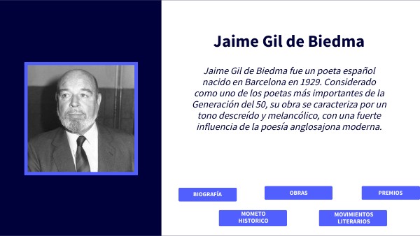 Jaime Gil de Biedma fue un poeta español nacido en Barcelona en 1929. Considerado como uno de los poetas más importantes de la Generación del 50, su obra se caracteriza por un tono descreído y melancólico, con una fuerte influencia de la poesía anglosajona moderna.