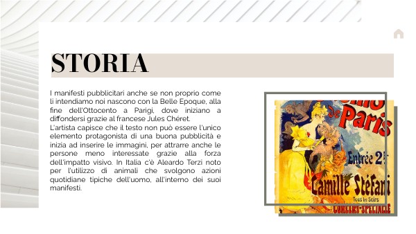 I manifesti pubblicitari anche se non proprio come li intendiamo noi nascono con la Belle Epoque, alla fine dell'Ottocento a Parigi, dove iniziano a diffondersi grazie al francese Jules Chéret. L'artista capisce che il testo non può essere l'unico elemento protagonista di una buona pubblicità e inizia ad inserire le immagini, per attrarre anche le persone meno interessate grazie alla forza dell'impatto visivo. In Italia c'è Aleardo Terzi noto per l'utilizzo di animali che svolgono azioni quotidiane tipiche dell'uomo, all'interno dei suoi manifesti.