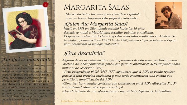 Margarita Salas fue una gran cientifica Española y en su honor hacemos esta pequeña infografía.