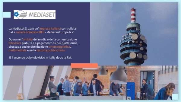 La Mediaset S.p.a è un' impresa italiana controllata dalla società olandese MFE - MediaForEurope N.V. Opera nell'ambito dei media e della comunicazione televisiva gratuita e a pagamento su più piattaforme, si occupa anche distribuzione cinematografica, multimediale e nella raccolta pubblicitaria. È il secondo polo televisivo in Italia dopo la Rai.