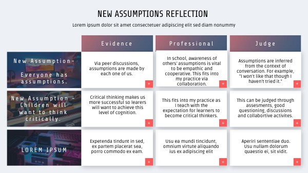 In school, awareness of others' assumptions is vital to be empathic and cooperative. This fits into my practice via collaboration.